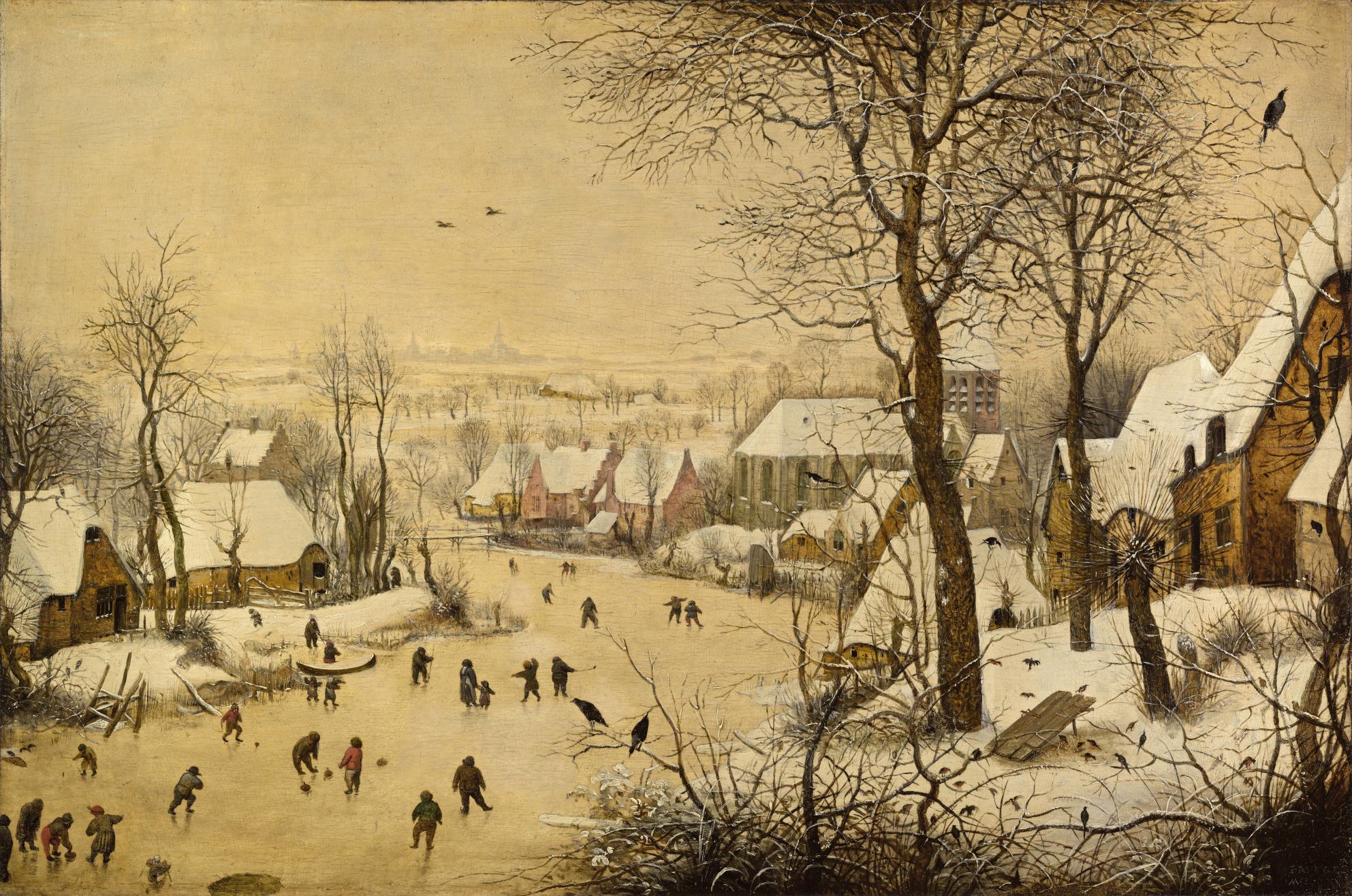 A river winds its way through the valley, with a bridge crossing it in the middle distance. It has flooded several of the surrounding fields, and the water has frozen into hard green ice. The villagers are taking advantage of it, skating or playing games on the newly-formed frozen lakes. Just below the foreground ridge an old woman trudges across a bridge with a load of twigs on her back for a fire, and a woman in a red skirt is pulled over the ice on a sledge.