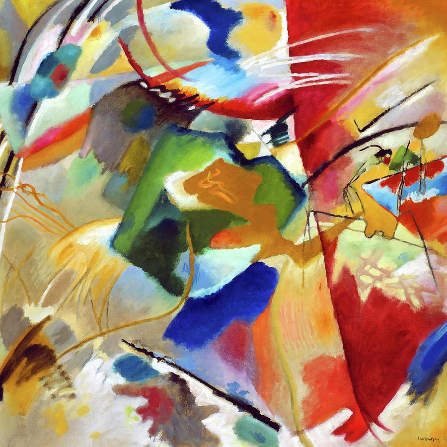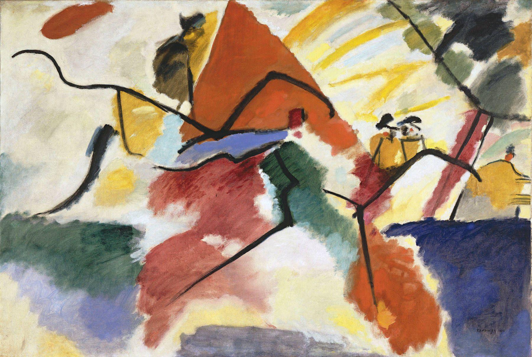 In 1901 he was one of the founders of an avant-garde exhibiting society called the Phalanx, the main forum for Jugendstil (Art Nouveau) in Germany, and in 1902 he joined the Berlin Sezession. Between 1903 and 1908 he travelled widely in western Europe and Africa. His pictures at the turn of the century combined features of Art Nouveau with reminiscences of Russian folk art, to which he added a Fauve-like intensity of colour. In 1908 he returned to Munich and began to eliminate the representational element from his work, until, in a series of Compositions, Improvisations, and Impressions, done between 1910 and 1913, he arrived at pure abstraction. (The best collection of works from this period is in the Lenbachhaus in Munich.) Kandinsky himself said that his understanding of the power of non-representational art derived from a night when he went into his studio in Munich and failed to recognize one of his own paintings that was lying the wrong way up, seeing in it a picture ‘of extraordinary beauty glowing with an inner radiance’.