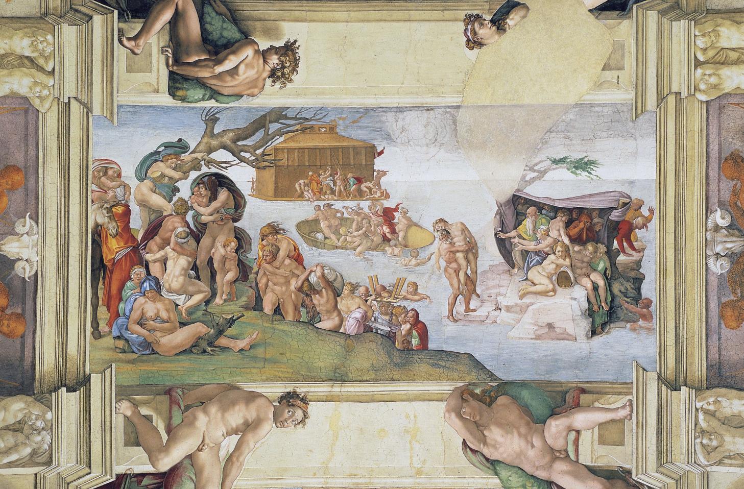 The chapel is 133 feet long, 43 feet wide, and 68 feet high, and it required a brilliant imagination to devise a scheme in which the whole vast ceiling was united. Michelangelo achieved it through a series of narrative paintings which tell the stories of Genesis until the Great Flood, and the stories of the life of Christ from the Gospel of St Matthew. He was determined to carry out the scheme virtually on his own, and, while Julius 11 agitated for its completion, Michelangelo worked for nearly four years under appalling difficulties, most of the time lying flat on his back on the scaffolding and unable to get a clear view of what he was doing. There are nearly 350 figures in the ceiling as a whole, in a wonderfully rich variety of poses which has been drawn on by artists ever since.