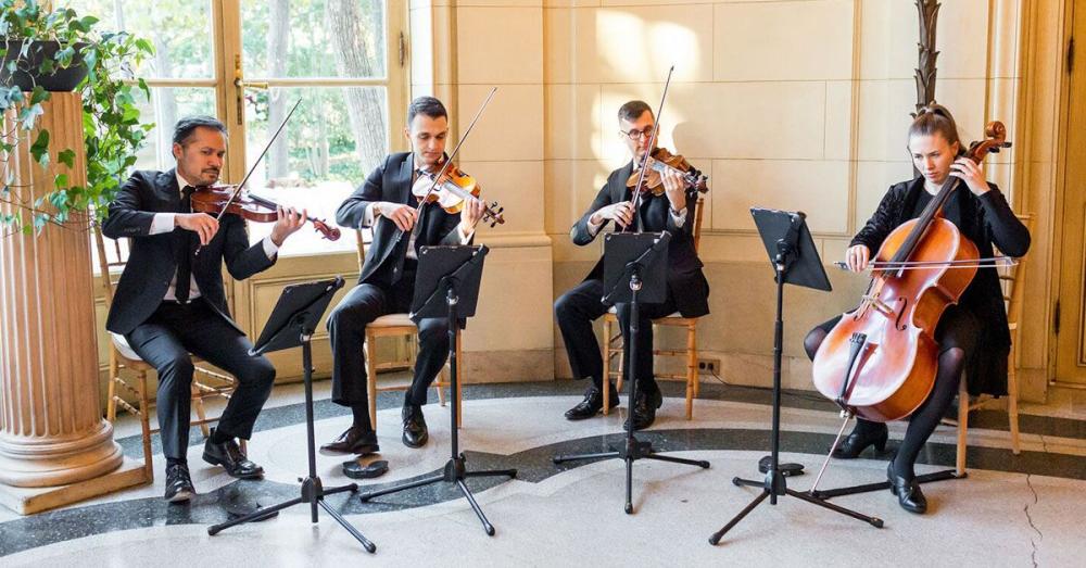 The string quartet consists of four people playing two violins, a viola and a cello. It was really established as a standard combination by the eighteenth century.